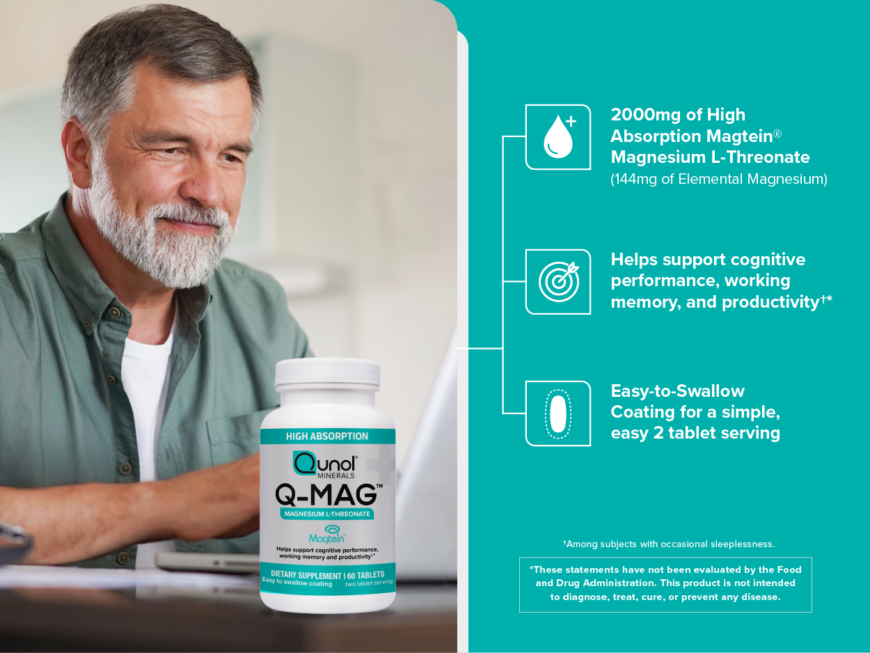 Qunol Q-Mag™ Magnesium L-Threonate helps support cognitive performance†, working memory†, productivity†, mental alertness†, restful sleep, healthy stress response, and positive mood.*